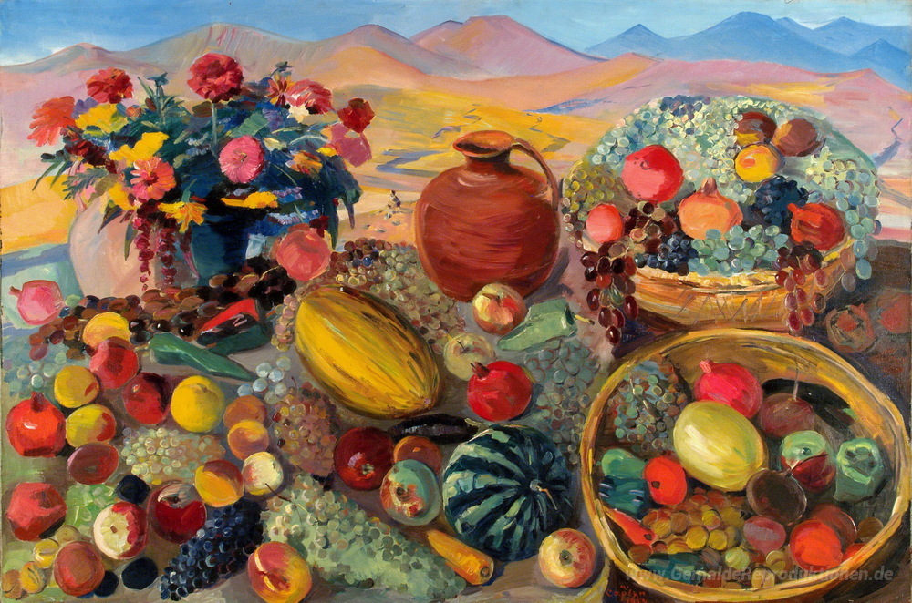 Wir bieten Ihnen eine handgefertigte Reproduktion auf Leinwand des berühmten Kunstwerks 'Geschenke des Herbstes' von Martiros Saryan, aus dem Reproduktionsmuseum.
