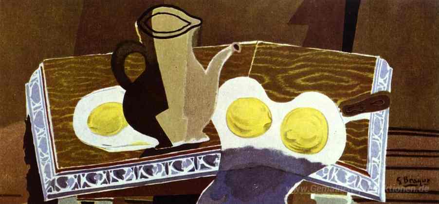Wir bieten Ihnen eine handgefertigte Reproduktion auf Leinwand des berühmten Kunstwerks 'Glaskrug und Zitronen' von Georges Braque, aus dem Reproduktionsmuseum.