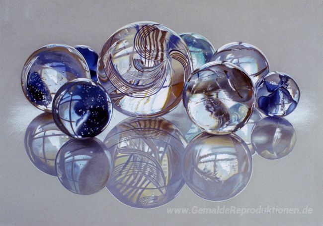 Wir bieten Ihnen eine handgefertigte Reproduktion auf Leinwand des berühmten Kunstwerks 'Glassies, Marbles XIV' von Charles Bell, aus dem Reproduktionsmuseum.