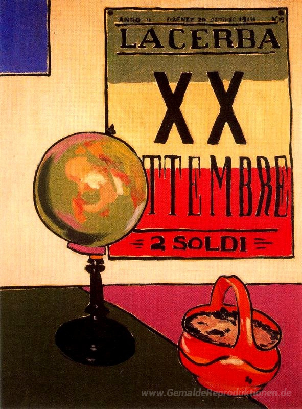 Wir bieten Ihnen eine handgefertigte Reproduktion auf Leinwand des berühmten Kunstwerks 'Karte der Welt und Lacerba' von Alberto Magnelli, aus dem Reproduktionsmuseum.