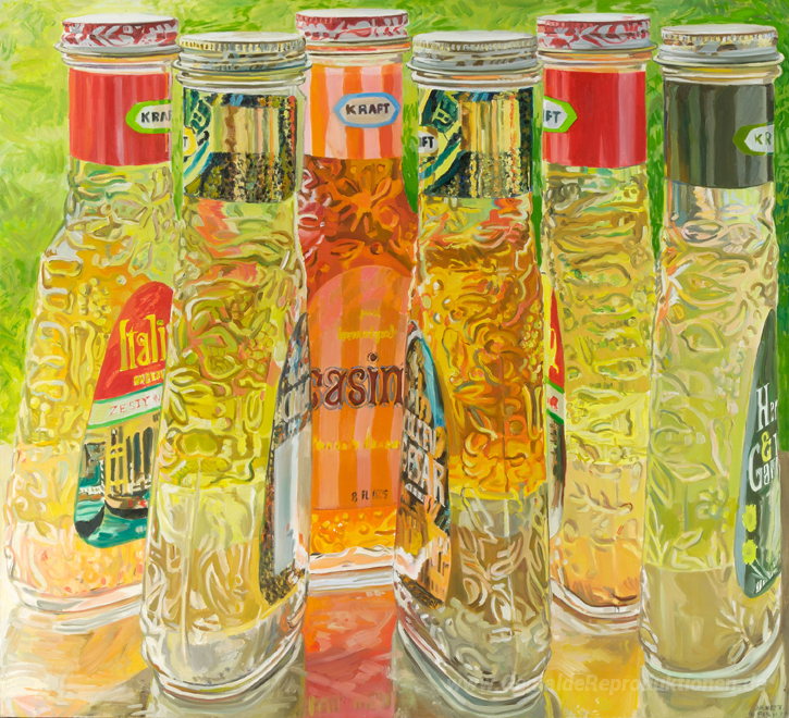 Wir bieten Ihnen eine handgefertigte Reproduktion auf Leinwand des berühmten Kunstwerks 'Kraft Salad Dressing' von Janet Fish, aus dem Reproduktionsmuseum.