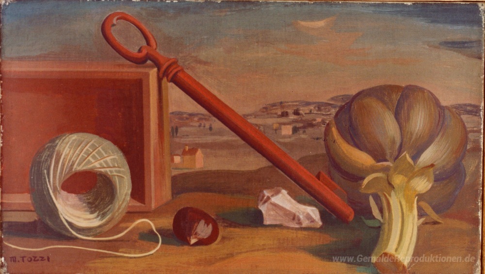 Wir bieten Ihnen eine handgefertigte Reproduktion auf Leinwand des berühmten Kunstwerks 'La Chiave e il Carciofo' von Mario Tozzi, aus dem Reproduktionsmuseum.