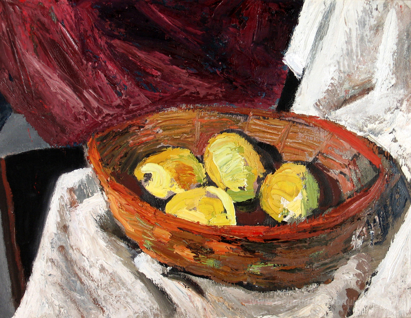 Wir bieten Ihnen eine handgefertigte Reproduktion auf Leinwand des berühmten Kunstwerks 'Lemon in einem Korb' von Jack Bush, aus dem Reproduktionsmuseum.