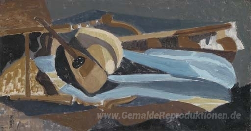 Wir bieten Ihnen eine handgefertigte Reproduktion auf Leinwand des berühmten Kunstwerks 'Mandoline sur Chaise' von Roger Bissière, aus dem Reproduktionsmuseum.
