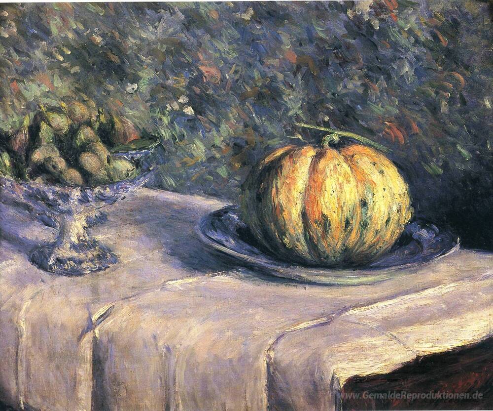 Wir bieten Ihnen eine handgefertigte Reproduktion auf Leinwand des berühmten Kunstwerks 'Melone und Frucht-Schale mit Feigen' von Gustave Caillebotte, aus dem Reproduktionsmuseum.
