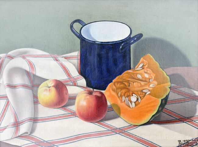 Wir bieten Ihnen eine handgefertigte Reproduktion auf Leinwand des berühmten Kunstwerks 'Natura morta con zucca' von Cagnaccio di San Pietro, aus dem Reproduktionsmuseum.