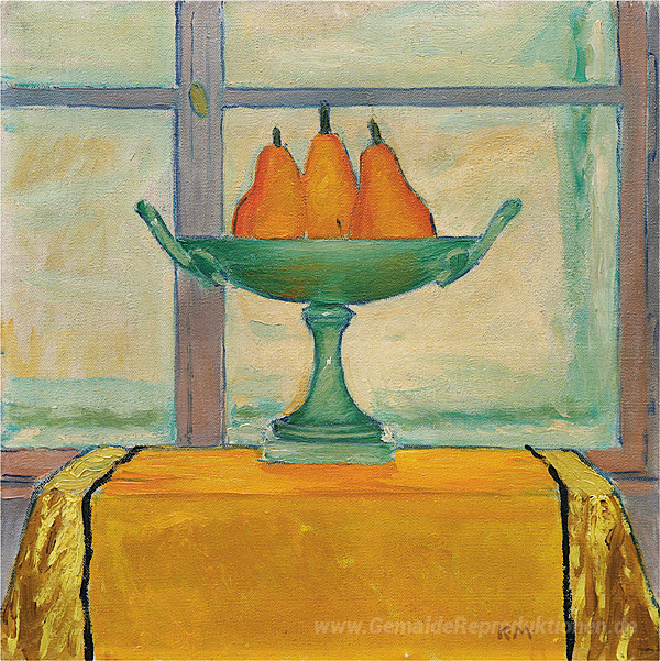 Wir bieten Ihnen eine handgefertigte Reproduktion auf Leinwand des berühmten Kunstwerks 'Obstschale mit drei roten und gelben Birnen' von Koloman Moser, aus dem Reproduktionsmuseum.