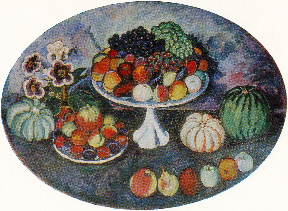 Wir bieten Ihnen eine handgefertigte Reproduktion auf Leinwand des berühmten Kunstwerks 'Oval Stilleben mit weißen Vase und Obst' von Ilya Mashkov, aus dem Reproduktionsmuseum.