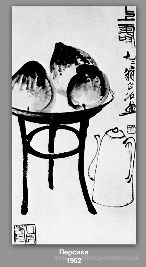 Entdecken Sie die faszinierenden Ölgemälde von Qi Baishi, einem der prominentesten chinesischen Künstler des 20. Jahrhunderts. Sein unverwechselbarer Stil kombiniert traditionelle Techniken mit einer modernen Ästhetik und verleiht jedem seiner Werke, einschließlich des meisterhaften Gemäldes Peaches, eine besondere Tiefe und Ausdruckskraft. Qi Baishi nutzt agile Pinselstriche und lebendige Farben, um die Schönheit der Natur einzufangen und eine harmonische Verbindung zwischen Kunst und Betrachter zu schaffen.