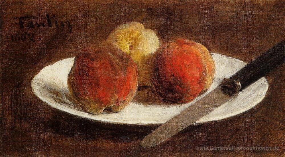 Wir bieten Ihnen eine handgefertigte Reproduktion auf Leinwand des berühmten Kunstwerks 'Plate of Peaches' von Henri Fantin-Latour, aus dem Reproduktionsmuseum.