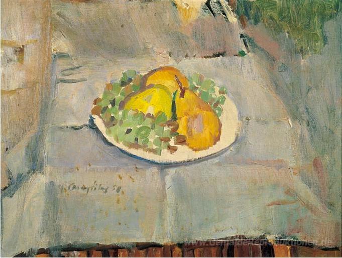 Wir bieten Ihnen eine handgefertigte Reproduktion auf Leinwand des berühmten Kunstwerks 'Platte mit Früchten' von George Mavroides, aus dem Reproduktionsmuseum.