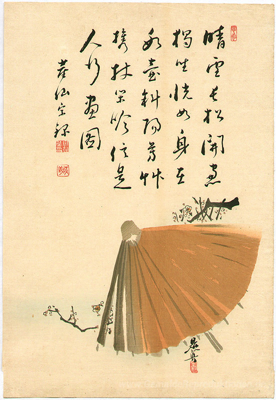 Wir bieten Ihnen eine handgefertigte Reproduktion auf Leinwand des berühmten Kunstwerks 'Regenschirm und Plum' von Shibata Zeshin, aus dem Reproduktionsmuseum.