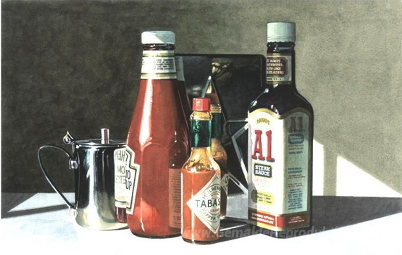 Willkommen in der faszinierenden Welt der Ölgemälde, wo jedes Kunstwerk eine Geschichte erzählt. Eines dieser bemerkenswerten Werke ist Sauces, geschaffen von dem talentierten Künstler Ralph Goings. Goings, bekannt für seine meisterhafte Kombination aus fotorealistischen Techniken und dem charmanten Flair des amerikanischen Alltags, bringt mit seinen Gemälden eine einzigartige Atmosphäre in jeden Raum.