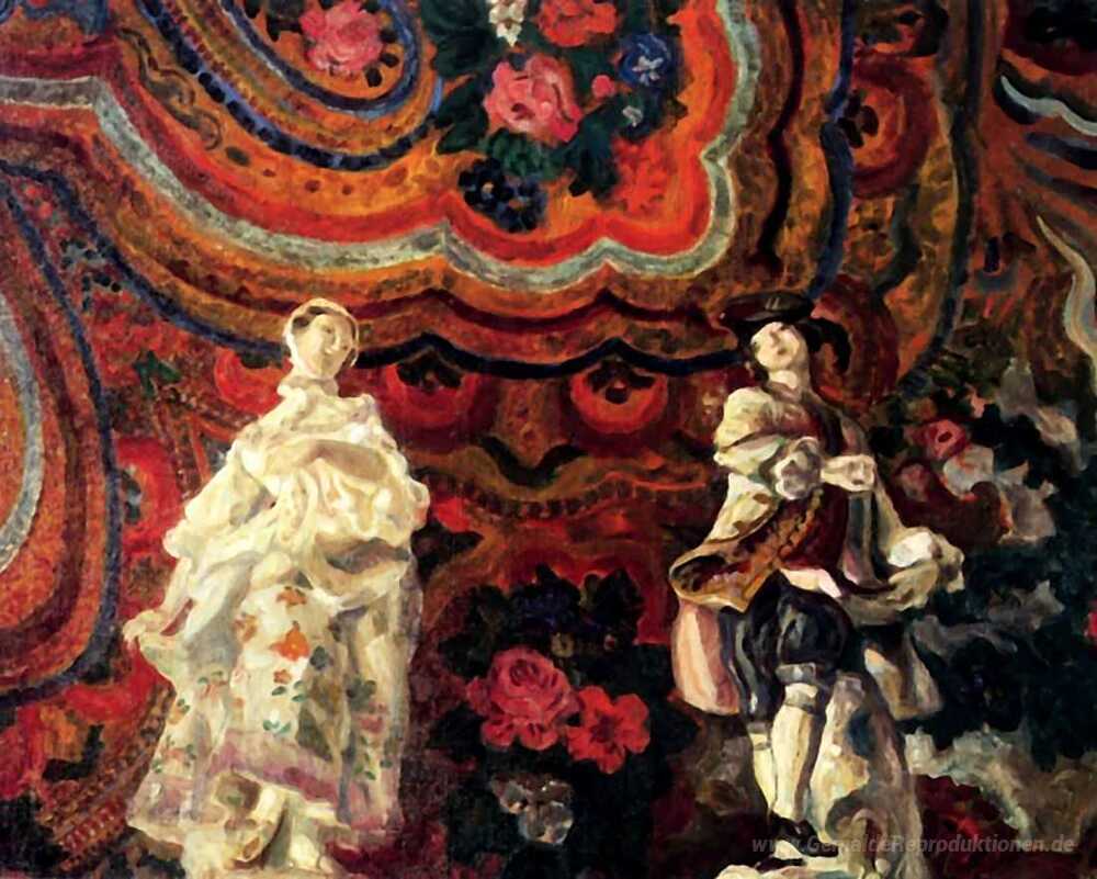 Wir bieten Ihnen eine handgefertigte Reproduktion auf Leinwand des berühmten Kunstwerks 'Saxon-Figuren' von Serge Sudeikin, aus dem Reproduktionsmuseum.