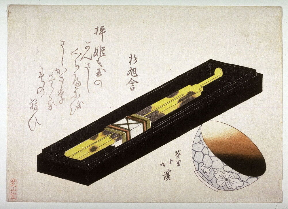 Wir bieten Ihnen eine handgefertigte Reproduktion auf Leinwand des berühmten Kunstwerks 'Schildpatt-Haarnadel und Porzellantasse mit einem Überzug aus Li' von Toyota Hokkei, aus dem Reproduktionsmuseum.