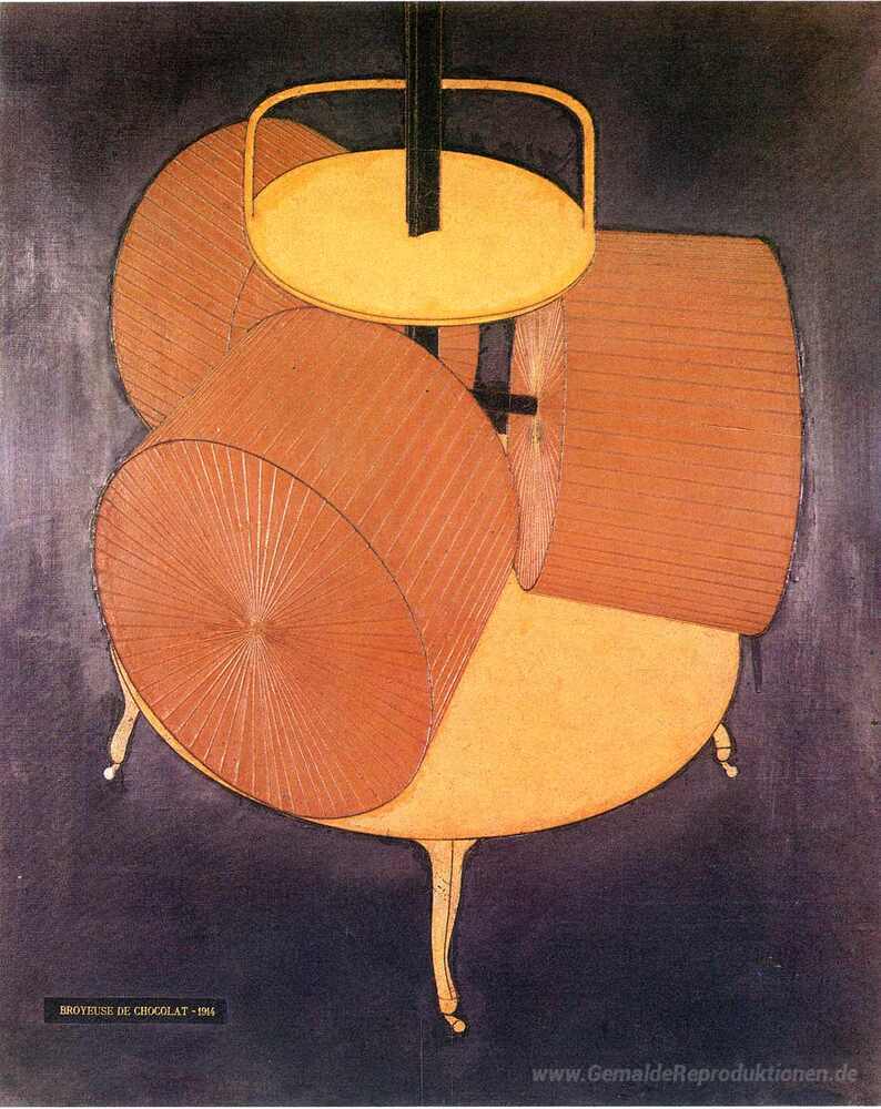 Wir bieten Ihnen eine handgefertigte Reproduktion auf Leinwand des berühmten Kunstwerks 'Schokolade Grinder' von Marcel Duchamp, aus dem Reproduktionsmuseum.