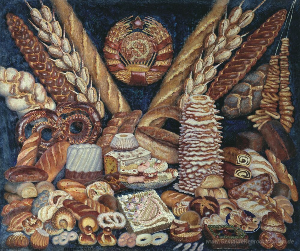Wir bieten Ihnen eine handgefertigte Reproduktion auf Leinwand des berühmten Kunstwerks 'Sowjet Brot' von Ilya Mashkov, aus dem Reproduktionsmuseum.