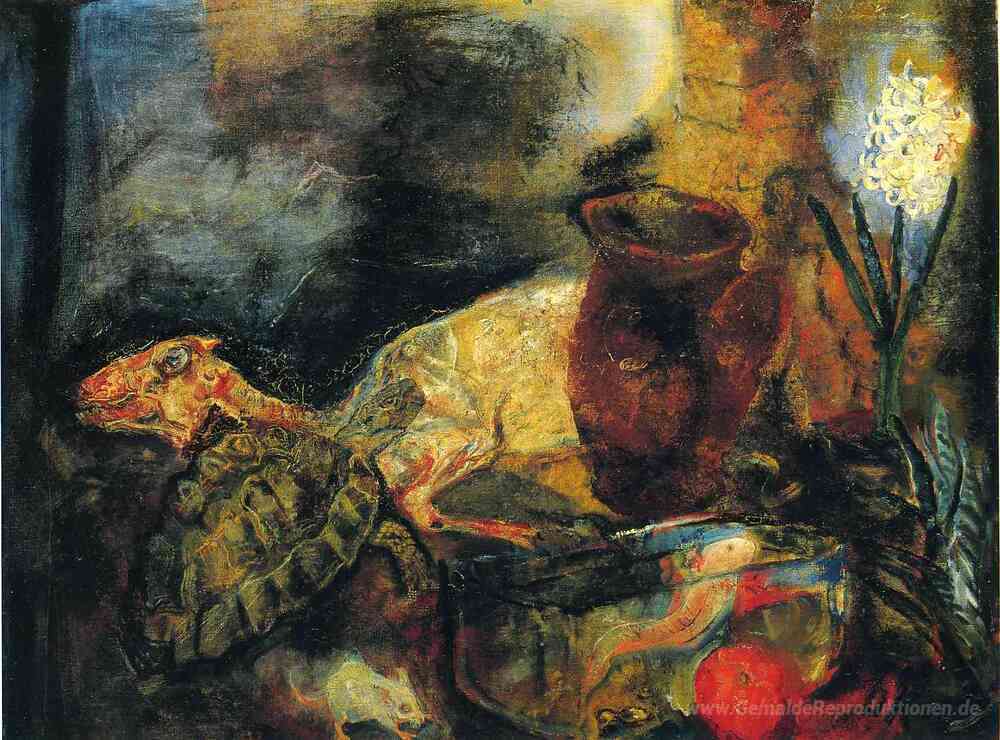 Wir bieten Ihnen eine handgefertigte Reproduktion auf Leinwand des berühmten Kunstwerks 'Stilleben mit einem geschlachteten Lamm' von Oskar Kokoschka, aus dem Reproduktionsmuseum.