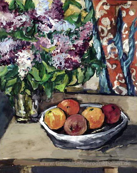 Wir bieten Ihnen eine handgefertigte Reproduktion auf Leinwand des berühmten Kunstwerks 'Stilleben mit lila und orange' von Pyotr Konchalovsky, aus dem Reproduktionsmuseum.