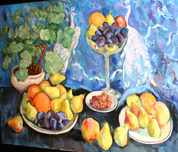 Wir bieten Ihnen eine handgefertigte Reproduktion auf Leinwand des berühmten Kunstwerks 'Stilleben mit Pfauen' von Ilya Mashkov, aus dem Reproduktionsmuseum.