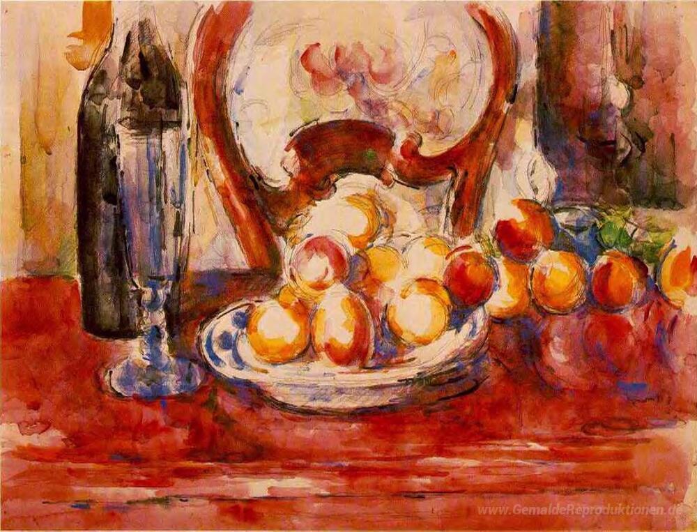 Wir bieten Ihnen eine handgefertigte Reproduktion auf Leinwand des berühmten Kunstwerks 'Stillleben Äpfel, eine Flasche und Chairback' von Paul Cezanne, aus dem Reproduktionsmuseum.