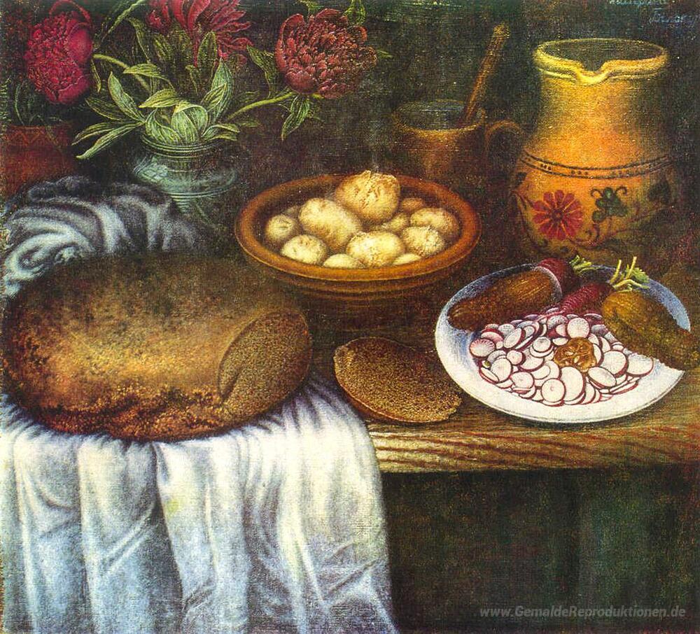 Wir bieten Ihnen eine handgefertigte Reproduktion auf Leinwand des berühmten Kunstwerks 'Stillleben "Breakfast"' von Kateryna Bilokur, aus dem Reproduktionsmuseum.