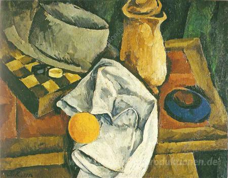 Wir bieten Ihnen eine handgefertigte Reproduktion auf Leinwand des berühmten Kunstwerks 'Stillleben. Checkers und Orangen.' von Pyotr Konchalovsky, aus dem Reproduktionsmuseum.