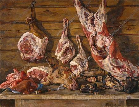 Wir bieten Ihnen eine handgefertigte Reproduktion auf Leinwand des berühmten Kunstwerks 'Stillleben. Das Fleisch.' von Pyotr Konchalovsky, aus dem Reproduktionsmuseum.