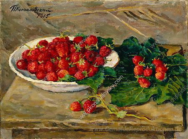 Wir bieten Ihnen eine handgefertigte Reproduktion auf Leinwand des berühmten Kunstwerks 'Stillleben. Erdbeeren.' von Pyotr Konchalovsky, aus dem Reproduktionsmuseum.