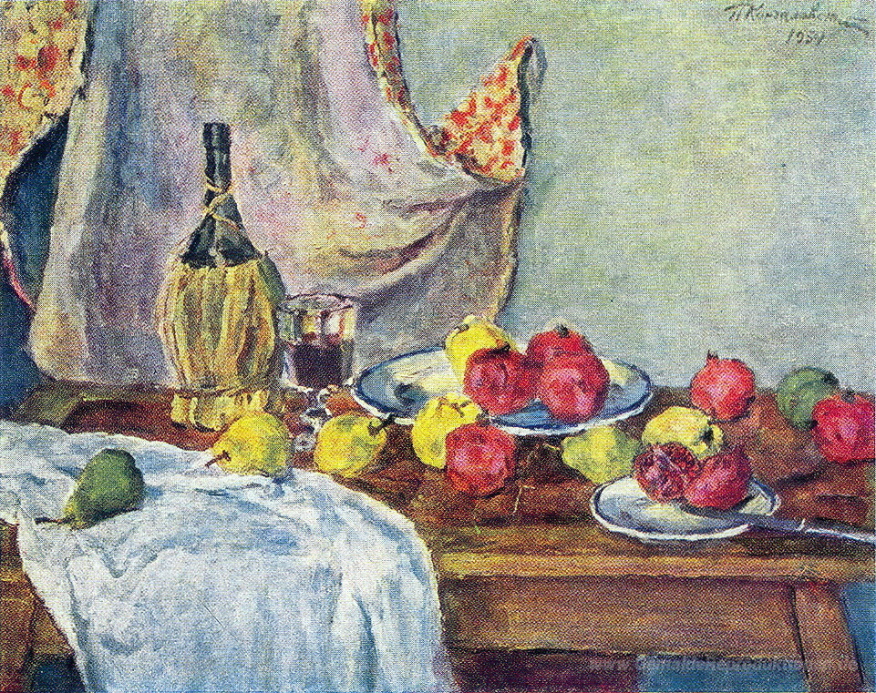 Wir bieten Ihnen eine handgefertigte Reproduktion auf Leinwand des berühmten Kunstwerks 'Stillleben. Granaten.' von Pyotr Konchalovsky, aus dem Reproduktionsmuseum.