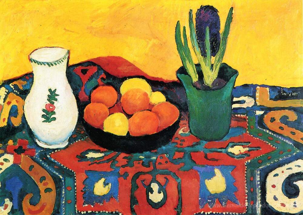 Wir bieten Ihnen eine handgefertigte Reproduktion auf Leinwand des berühmten Kunstwerks 'Stillleben Hyazinthen Teppich' von August Macke, aus dem Reproduktionsmuseum.