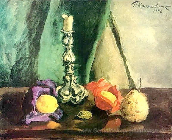 Das Gemälde Stillleben. Kerzenhalter und Birne bringt eine elegante und gleichzeitig stille Atmosphäre in jeden Raum, ideal für Wohnzimmer oder Essbereiche. Die sanften Farben und die liebevolle Darstellung der alltäglichen Objekte schaffen eine einladende Umgebung, in der sich Gäste wohlfühlen. Bereichern Sie Ihr Zuhause mit diesem zeitlosen Kunstwerk und lassen Sie die Kunst von Pyotr Konchalovsky Ihre Wände erstrahlen.