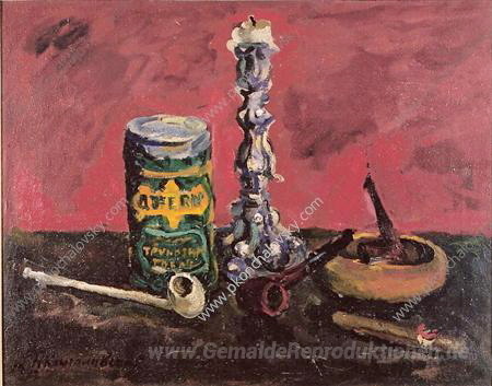 Wir bieten Ihnen eine handgefertigte Reproduktion auf Leinwand des berühmten Kunstwerks 'Stillleben. Kerzenhalter und das Rohr auf einem roten Hintergrun' von Pyotr Konchalovsky, aus dem Reproduktionsmuseum.