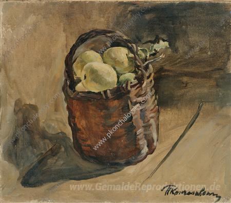 Wir bieten Ihnen eine handgefertigte Reproduktion auf Leinwand des berühmten Kunstwerks 'Stillleben. Korb mit Äpfeln auf dem Boden.' von Pyotr Konchalovsky, aus dem Reproduktionsmuseum.