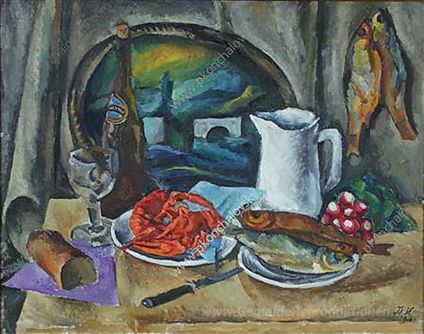 Wir bieten Ihnen eine handgefertigte Reproduktion auf Leinwand des berühmten Kunstwerks 'Stillleben. Krebserkrankungen.' von Pyotr Konchalovsky, aus dem Reproduktionsmuseum.