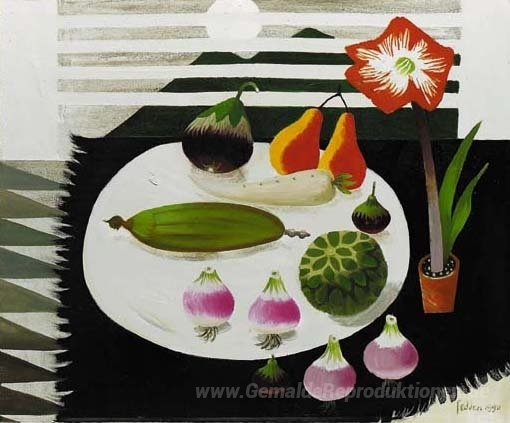 Wir bieten Ihnen eine handgefertigte Reproduktion auf Leinwand des berühmten Kunstwerks 'Stillleben mit Birnen und Zwiebeln' von Mary Fedden, aus dem Reproduktionsmuseum.