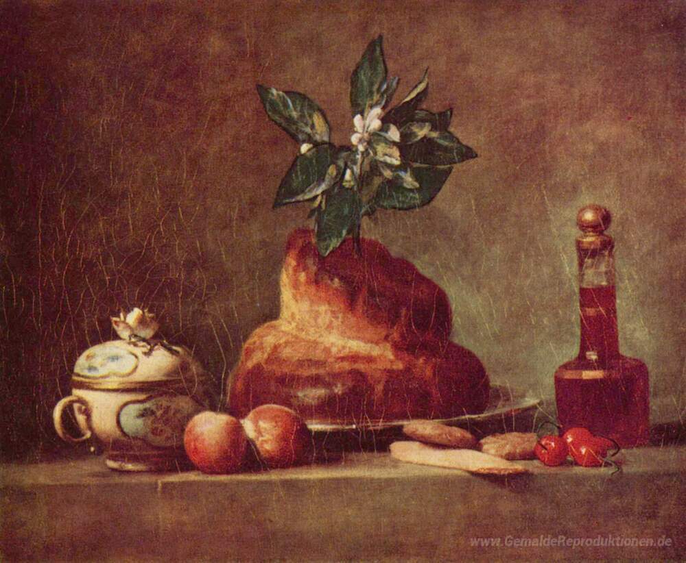 Wir bieten Ihnen eine handgefertigte Reproduktion auf Leinwand des berühmten Kunstwerks 'Stillleben mit Brioche' von Jean-Baptiste-Simeon Chardin, aus dem Reproduktionsmuseum.
