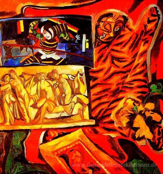 Wir bieten Ihnen eine handgefertigte Reproduktion auf Leinwand des berühmten Kunstwerks 'Stillleben mit einem Tige' von Natalia Goncharova, aus dem Reproduktionsmuseum.