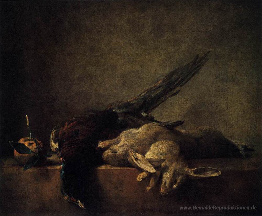 Wir bieten Ihnen eine handgefertigte Reproduktion auf Leinwand des berühmten Kunstwerks 'Stillleben mit Fasan' von Jean-Baptiste-Simeon Chardin, aus dem Reproduktionsmuseum.