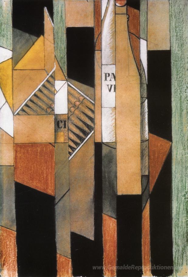 Wir bieten Ihnen eine handgefertigte Reproduktion auf Leinwand des berühmten Kunstwerks 'Stillleben mit Flasche und Zigarren' von Juan Gris, aus dem Reproduktionsmuseum.