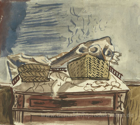 Wir bieten Ihnen eine handgefertigte Reproduktion auf Leinwand des berühmten Kunstwerks 'Stillleben mit Körben' von Yiannis Tsaroychis, aus dem Reproduktionsmuseum.