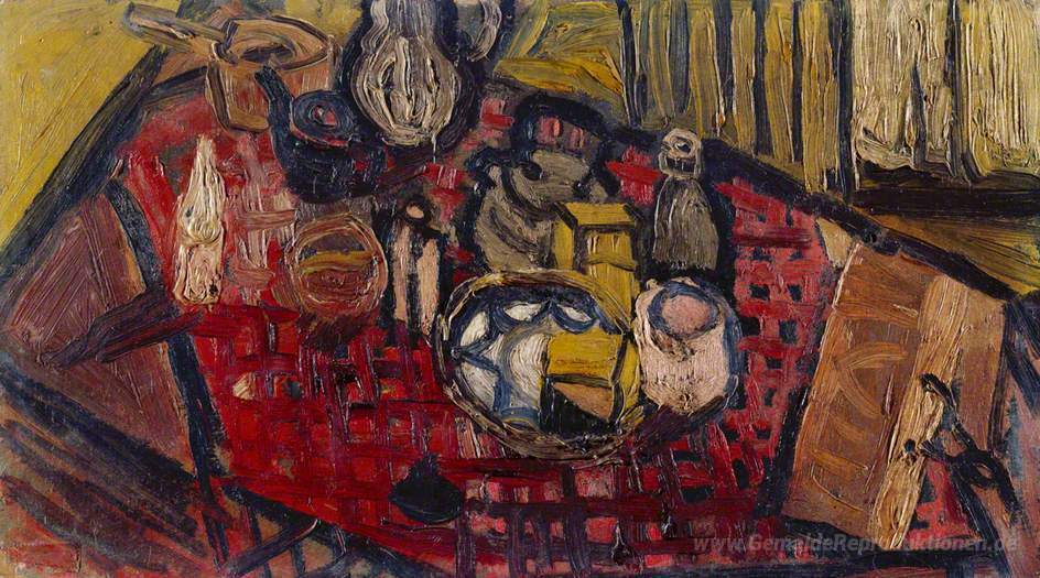 Wir bieten Ihnen eine handgefertigte Reproduktion auf Leinwand des berühmten Kunstwerks 'Stillleben mit Karotuch' von John Bratby, aus dem Reproduktionsmuseum.