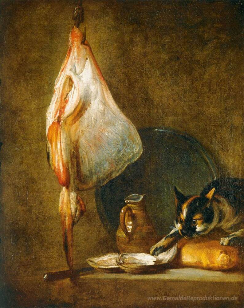 Die Verwendung von leuchtenden Farben und detaillierten Texturen verleiht diesem Gemälde nicht nur Leben, sondern beeinflusst auch die Atmosphäre des Raums, in dem es präsentiert wird. Kunstliebhaber erkennen schnell, wie Stillleben mit Katze und Rayfish subtile Eleganz und Ruhe in Ihr Zuhause bringt, während es gleichzeitig als Gesprächsthema dient. Entdecken Sie die Zeitlosigkeit und den Charme von Chardins Werken und bereichern Sie Ihr Zuhause mit einem einzigartigen Kunstwerk.