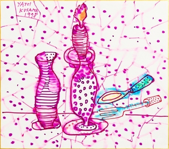 Wir bieten Ihnen eine handgefertigte Reproduktion auf Leinwand des berühmten Kunstwerks 'Stillleben mit Kerzenhalter' von Yayoi Kusama, aus dem Reproduktionsmuseum.