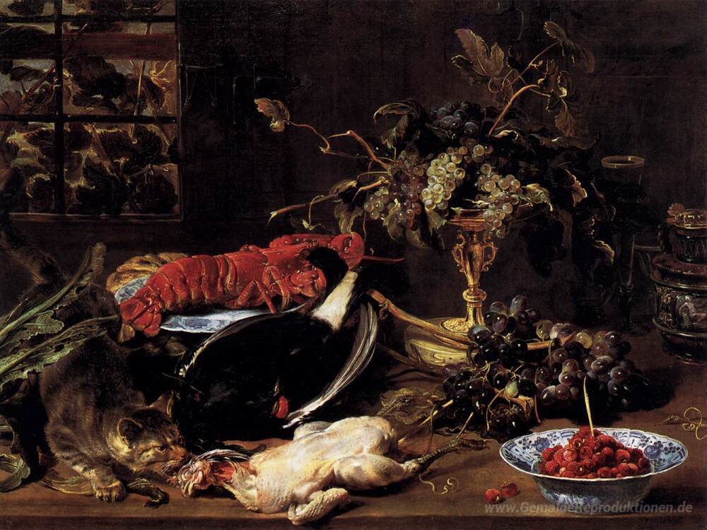 Wir bieten Ihnen eine handgefertigte Reproduktion auf Leinwand des berühmten Kunstwerks 'Stillleben mit Krabben, Geflügel, Obst und' von Frans Snyders, aus dem Reproduktionsmuseum.