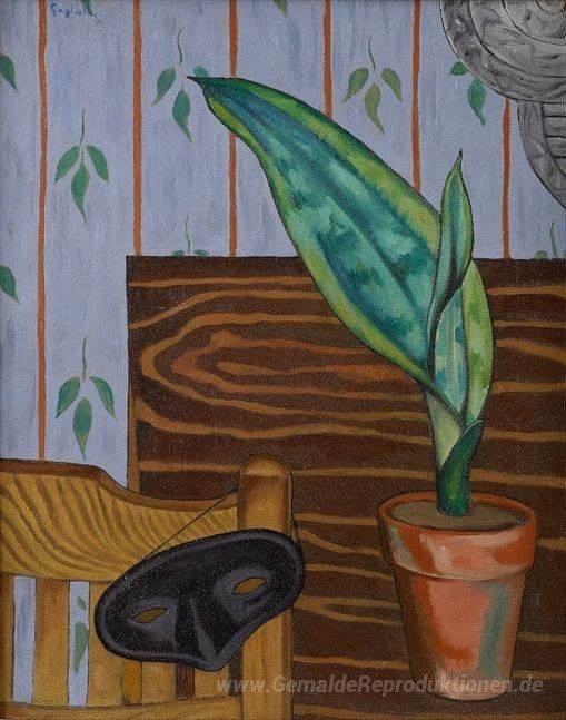 Wir bieten Ihnen eine handgefertigte Reproduktion auf Leinwand des berühmten Kunstwerks 'Stillleben mit Maske' von O. Louis Guglielmi, aus dem Reproduktionsmuseum.