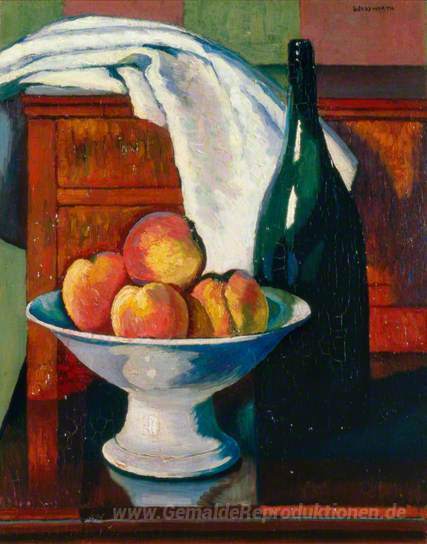 Wir bieten Ihnen eine handgefertigte Reproduktion auf Leinwand des berühmten Kunstwerks 'Stillleben mit Obst und eine Flasche' von Edward Wadsworth, aus dem Reproduktionsmuseum.
