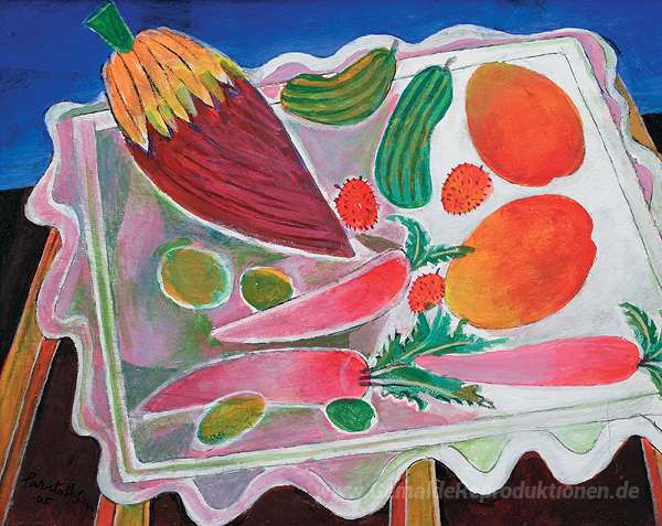 Willkommen in unserer exklusiven Auswahl an Ölgemälden, wo Kunst und Emotionen harmonisch zusammenkommen. Eines der herausragenden Werke in unserer Kollektion ist das Stillleben mit Obst und Gemüse des bedeutenden Künstlers Paritosh Sen. Sen, bekannt für seine meisterhafte Beherrschung der Farben und Komposition, fängt die Schönheit der Natur mit einem einzigartigen Blickwinkel, der die Sinne anregt und die Einzigartigkeit jedes Motivs betont.