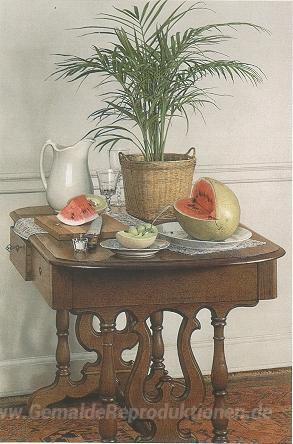 Wir bieten Ihnen eine handgefertigte Reproduktion auf Leinwand des berühmten Kunstwerks 'Stillleben mit Wassermelone' von John Stuart Ingle, aus dem Reproduktionsmuseum.