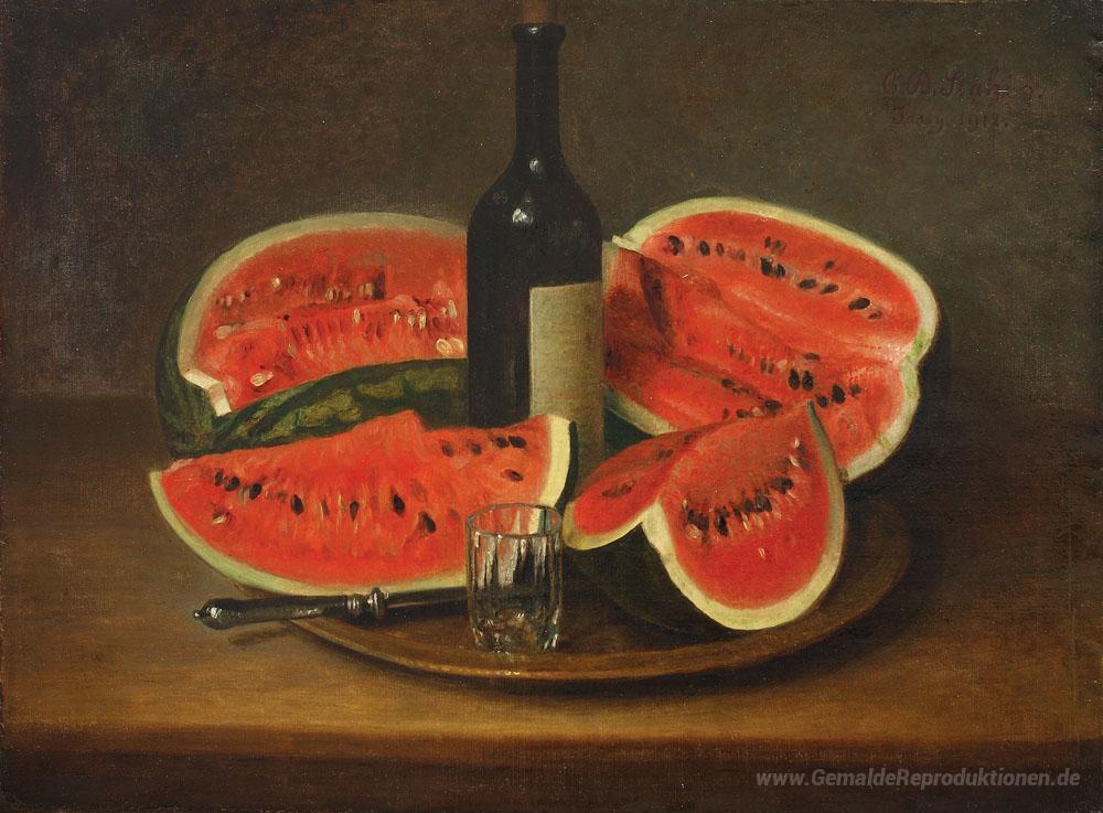 Wir bieten Ihnen eine handgefertigte Reproduktion auf Leinwand des berühmten Kunstwerks 'Stillleben mit Wassermelonen' von Constantin Stahi, aus dem Reproduktionsmuseum.